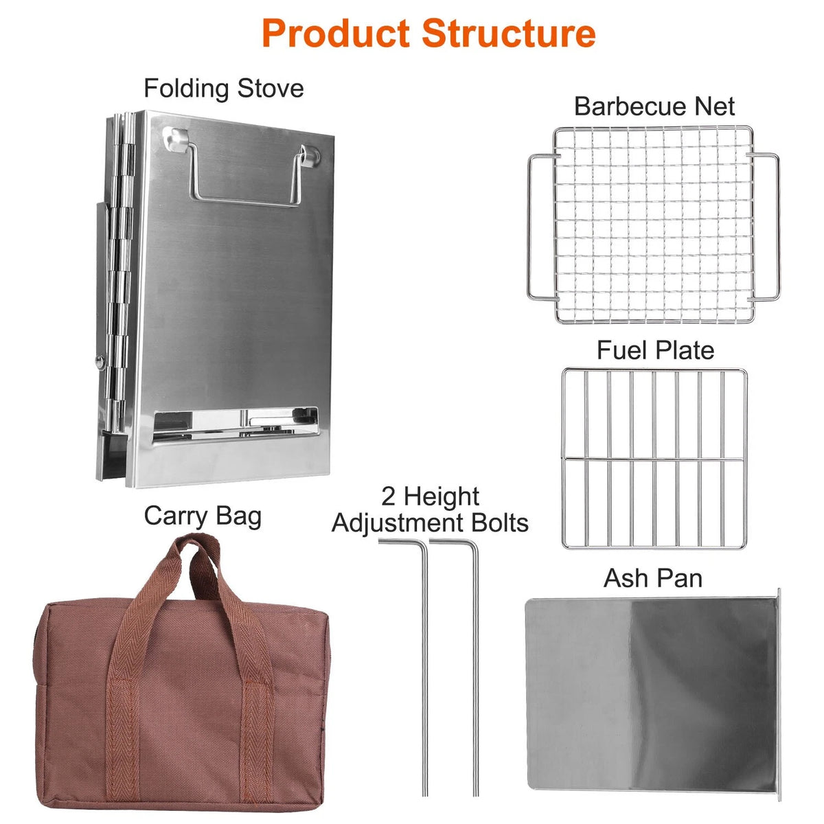 Cook anywhere with this rugged, packable stove built from heavy-duty 410/304 stainless steel. It folds to book size, rides flat in your pack, and sets up in minutes. Burn what you have, sticks, twigs, wood, charcoal, solid fuel tablets, or a spirit/alcohol burner, to boil water, sear a quick meal, or grill over the included top grate. Precision-cut panels lock up solid, giving you a stable cooking platform that supports up to 33 lb (15 kg). Vent holes and a side feed opening keep air flowing so fires light fast and burn efficiently. Perfect for backpacking, bug-out bags, overlanding, hunting camps, tailgates, beach cookouts, and power-out emergencies. For outdoor use only.