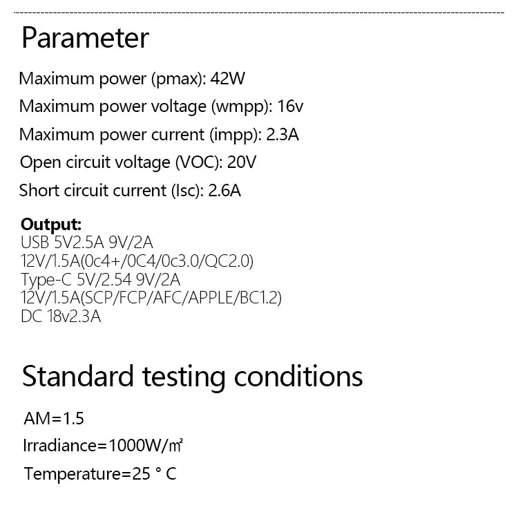 SPECIFICATIONSBrand Name: NoEnName_NullCertification: CE,FCCChoice: yesFlexible Solar Panel: NoFoldable Solar Panel: YesHigh-concerned chemical: NoneMaterial: Monocrystalline SiliconMax. Power: 1000WModel Number: BSY-800W(42W)Module Efficien:...