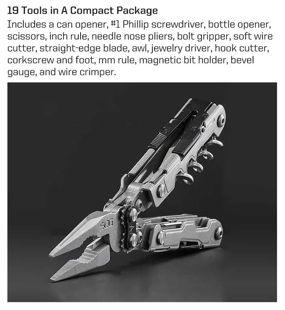 SPECIFICATIONSApplication: Multi FunctionalBrand Name: SOGChoice: yesDIY Supplies: CampingFeatures: MultifunctionalHandle Style: StraightHigh-concerned chemical: NoneMaterial: Stainless SteelModel Number: PL1001-CPOrigin: Mainland ChinaPlier Style:...