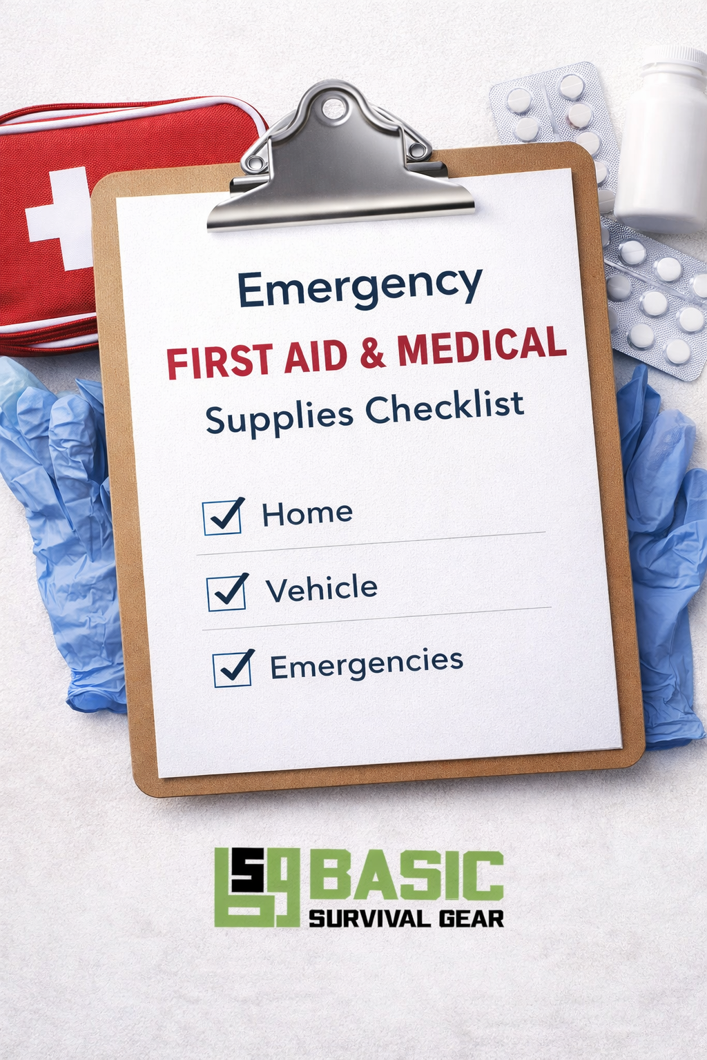 A printable checklist to help you organize essential first aid and medical supplies for home, vehicle, and emergency use.
